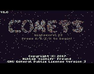 Comets - An arcade game about destroying comets Copyright (C) 2017 Niklas 'Nalquas' Freund This program is free software: you can redistribute it and/or modify it under the terms of the GNU General Public License as published by the Free Software Foundation, either version 3 of the License, or (at your option) any later version. This program is distributed in the hope that it will be useful, but WITHOUT ANY WARRANTY; without even the implied warranty of MERCHANTABILITY or FITNESS FOR A PARTICULAR PURPOSE. See the GNU General Public License for more details. You should have received a copy of the GNU General Public License along with this program. If not, see http://www.gnu.org/licenses/.